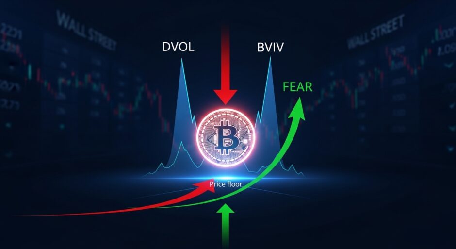 まず、記事の核心にある指標を整理します。DVOLはDeribitが算出するビットコインの30日インプライド・ボラティリティ指数、BVIVはVolmexが提供する同種の指数です。どちらもオプション市場の価格から「今後1か月でどれほど価格が動くか」をリアルタイムで測るもので、株式市場のVIX(恐怖指数)に相当します。VIXと同様、これらの指数は平時には低く安定し、パニック時に急騰するという性質を持ちます。